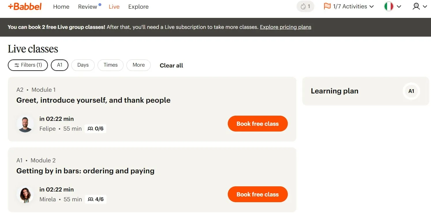 The user has immediate access to a couple of live classes, although you need a life subscription to access more than the two free classes provided.