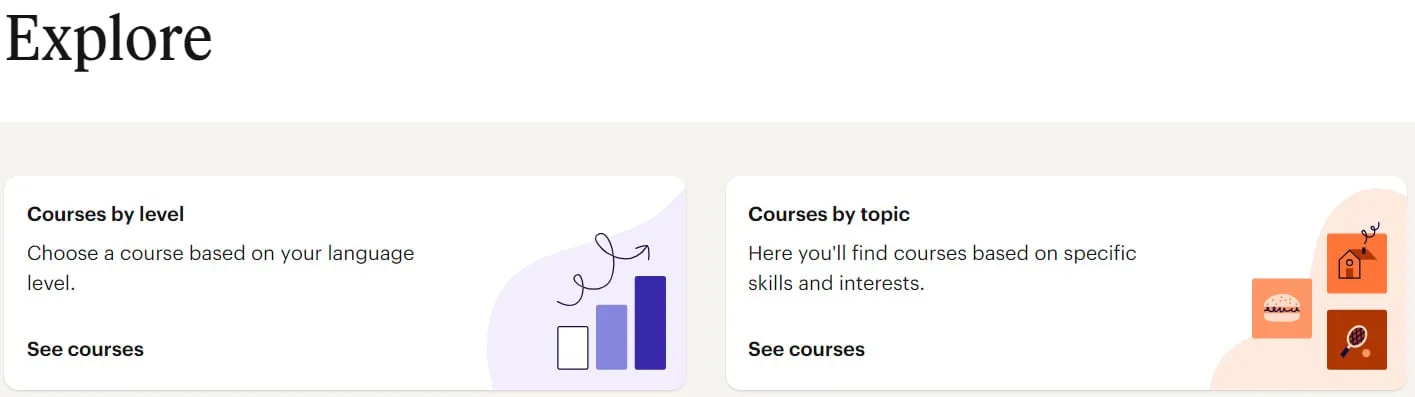 Choosing your lessons by topic allows you to focus on specific skills like grammar, listening, and, most importantly, speaking. This section promises to help with pronunciation and communication skills.