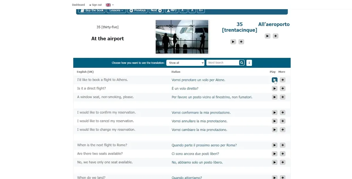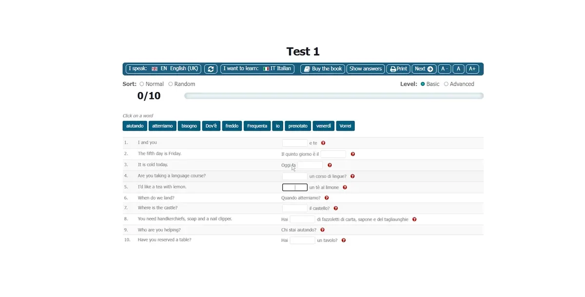 50Languages هو في الأساس كتاب تفسير العبارات الشائعة التفاعلي. يمنحك 100 درس قصير، يغطي كل منها موضوعات يومية مثل التحيات، أو الطلب في مطعم، أو الأرقام، أو الألوان، أو السؤال عن الاتجاهات. لقد جربته مع اللغة الإيطالية، وما لاحظته على الفور هو أنه لا يعلمك حقًا كيفية عمل اللغة، بل يمنحك جملًا جاهزة للاستخدام. وهذا يجعلها مفيدة إذا كنت مسافرًا أو إذا كنت تريد فقط البدء ببعض العبارات السريعة.