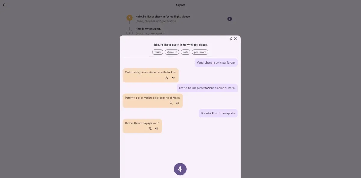 عندما أفتح المنصة، يمكنني اختيار اللغة الإيطالية وتحديد مستواي واختيار السيناريو - على سبيل المثال، شيء مثل طلب الطعام أو إجراء محادثة غير رسمية. بمجرد أن أبدأ، فقط اضغط على الميكروفون وأبدأ في التحدث. ما لاحظته على الفور هو أن التفاعل يبدو وكأنه محادثة ذهابًا وإيابًا وليس تمرينًا منظمًا. يستجيب الذكاء الاصطناعي بالصوت، ويمكنني أن أستغرق وقتي قبل الإجابة، مما يجعل الأمر أقل إرهاقًا.