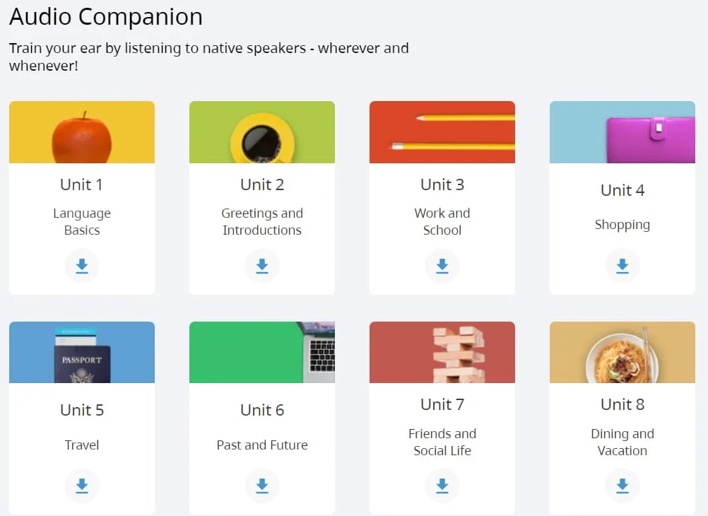Rosetta Stone bietet Sprachführer und begleitende Audioübungen, die Sie herunterladen und beim Pendeln oder in Ihrer Freizeit verwenden können.