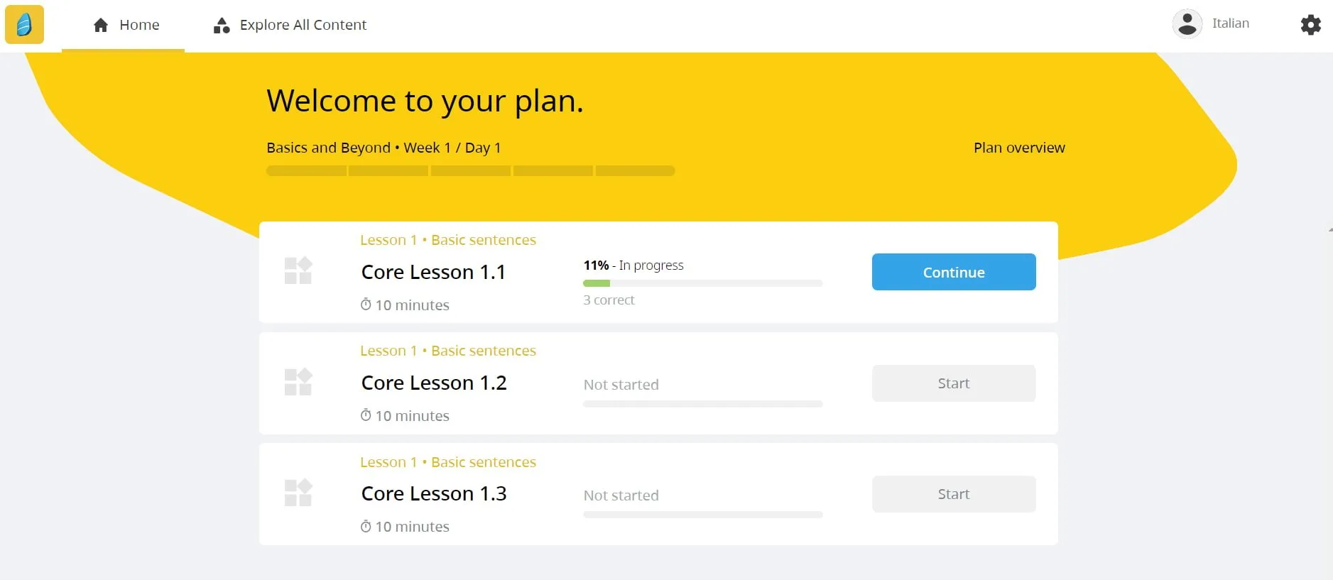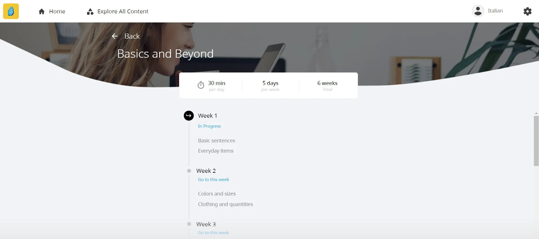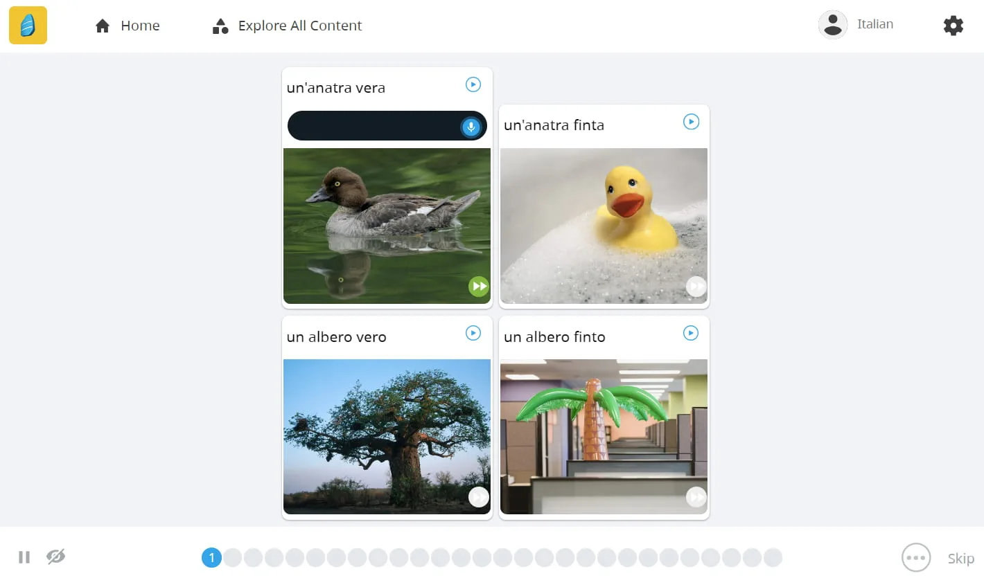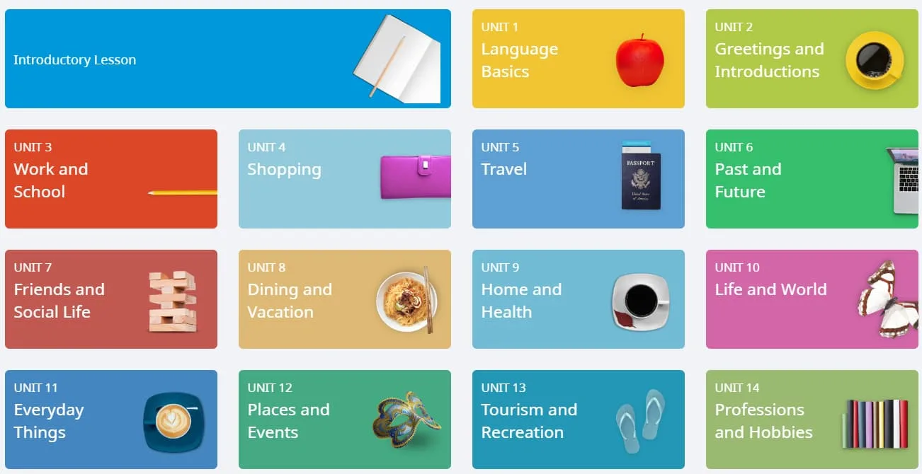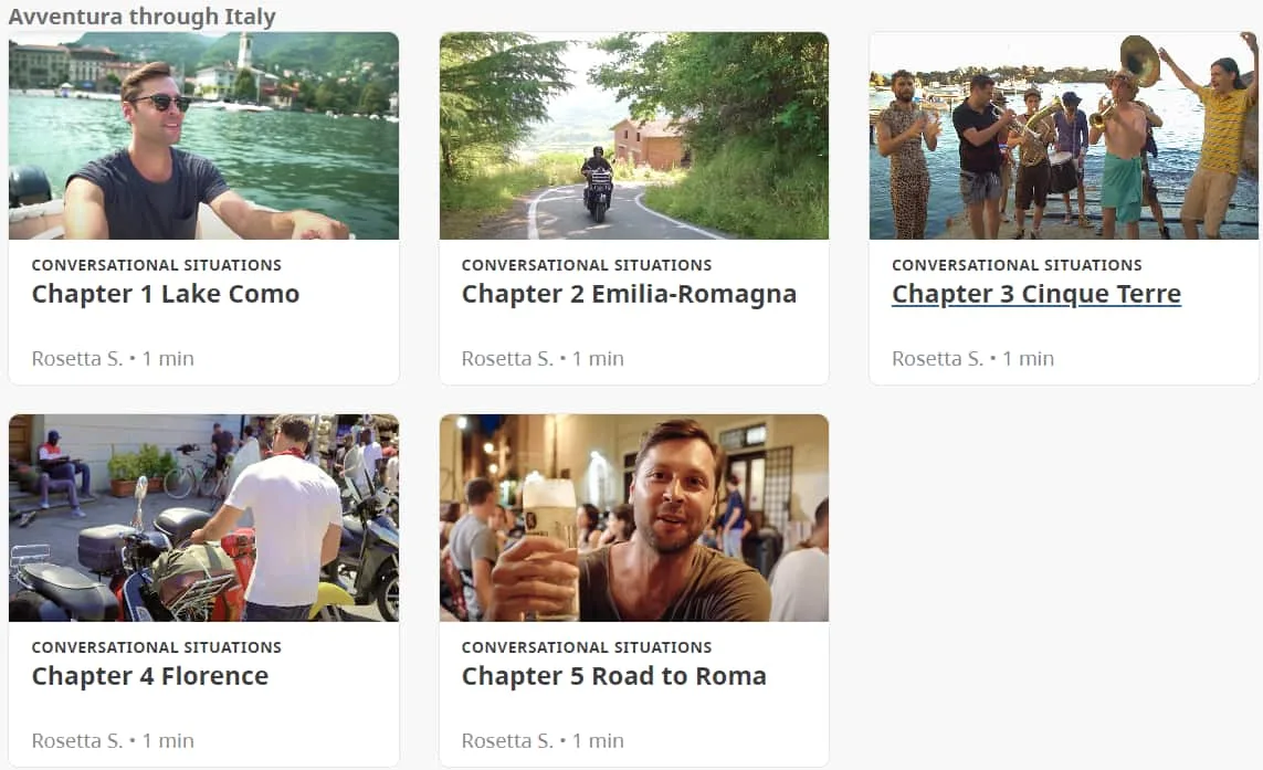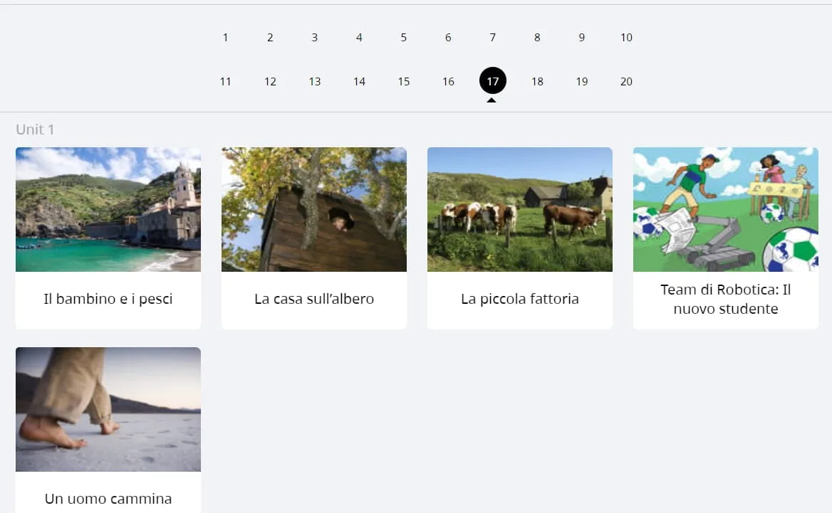 Als nächstes wagte ich mich an den Abschnitt mit dem Titel „Alle Inhalte erkunden“. Hier sehen Sie alle Einheiten, die Rosetta Stone anbietet, von Einheit eins bis Einheit zwanzig. Jede Einheit ist nach Themen wie Sprachen, Vergangenheit und Zukunft, Reisen, Tourismus, Familie und Gemeinschaft unterteilt, deren Schwierigkeitsgrad [allmählich zunimmt] (https://www.thinkinitalian.com/comprehensible-input-italian/).