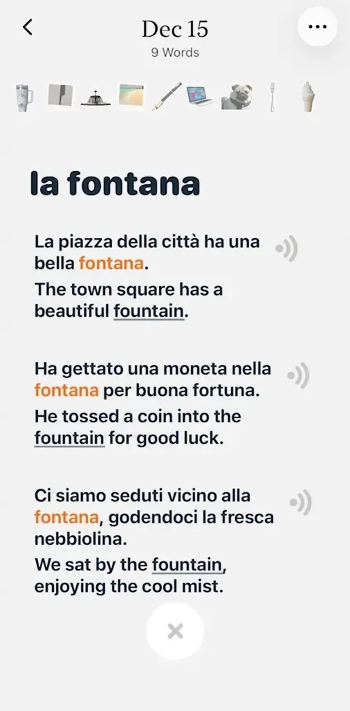 Cuando reviso una palabra más tarde, veo la imagen en un lado y la palabra italiana en el otro. Normalmente digo la palabra en voz alta, escucho la pronunciación y la conecto con la imagen. Es muy visual y sensorial, lo que hace que sea más fácil de recordar.