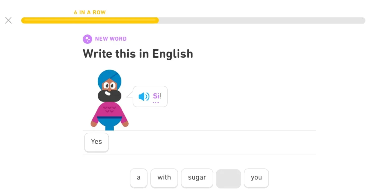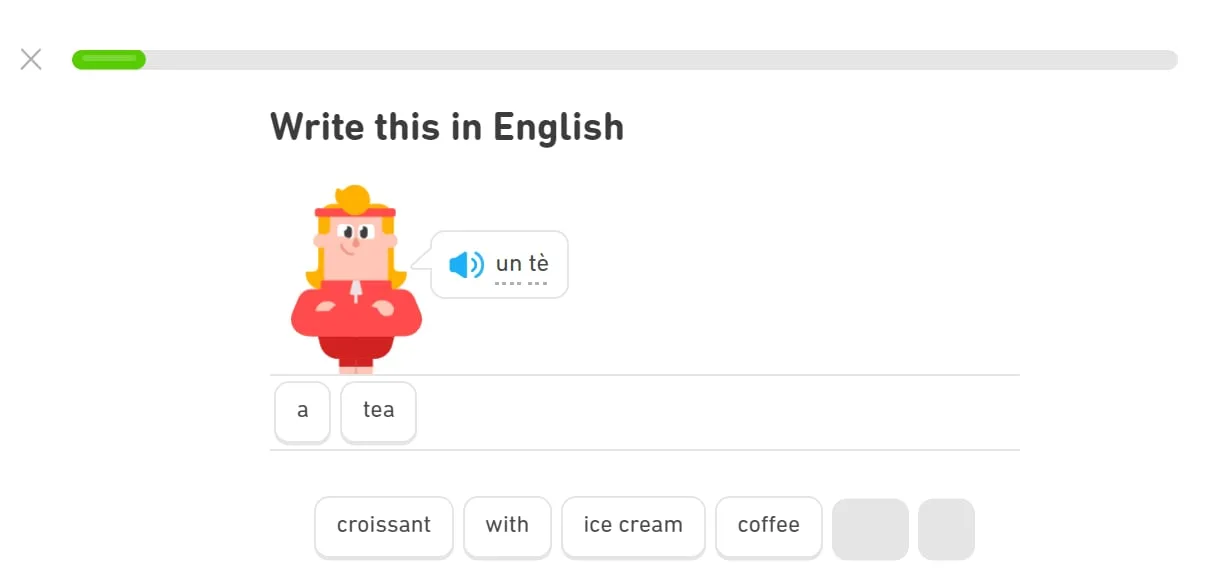 Históricamente, Duolingo ha enfatizado la traducción y la mecanografía en lugar de hablar. En esta ocasión, cuando probé una lección, me presentó ejercicios como emparejar pares, escuchar y luego traducir y escribir. Estos ejercicios son útiles para principiantes que necesitan comprender el significado de las palabras, pero se quedan cortos cuando se trata de mejorar las habilidades para hablar.