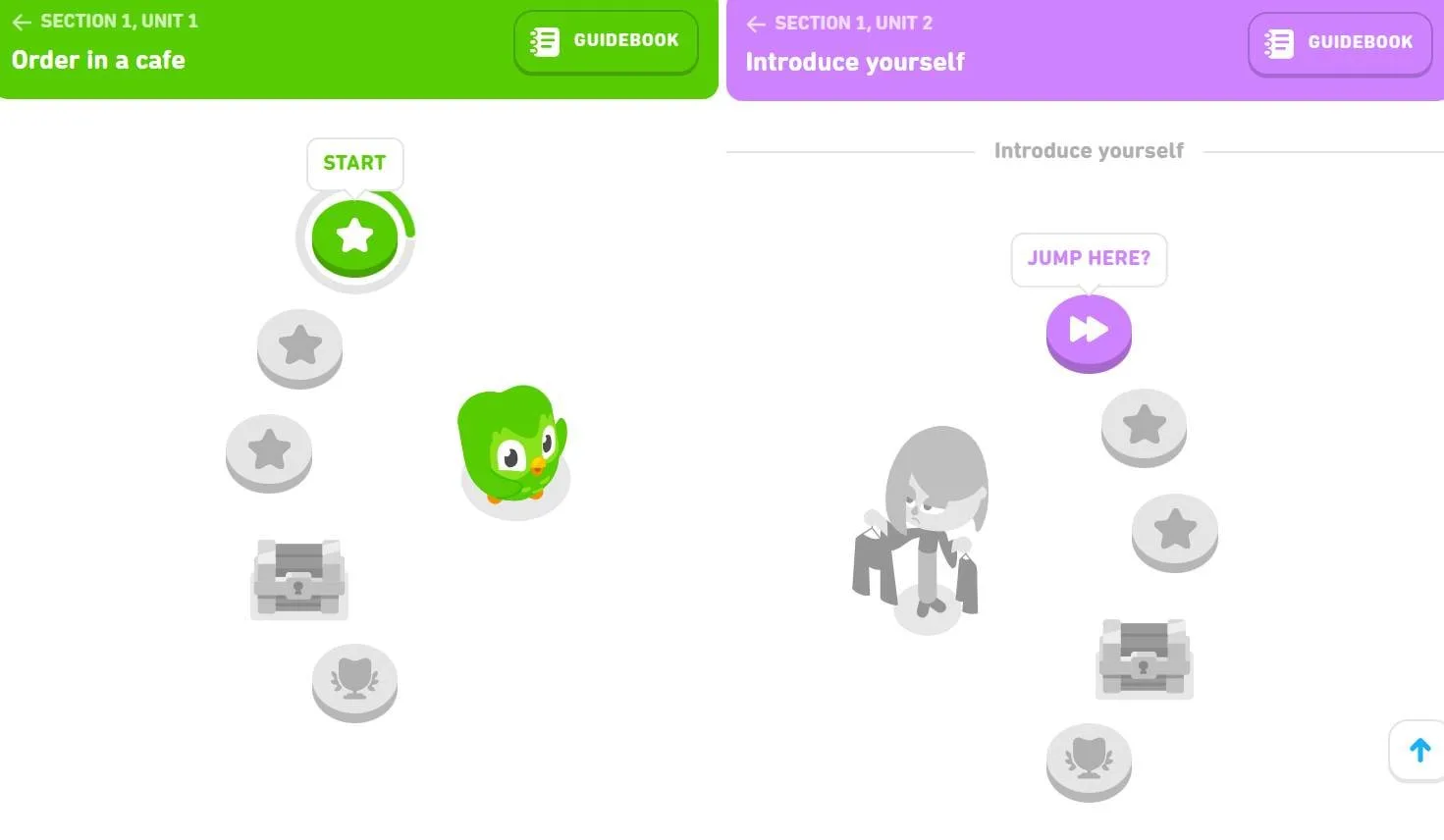 La interfaz principal muestra un camino que organiza las lecciones de forma lineal y progresiva. Debes seguir este camino para completar el curso.