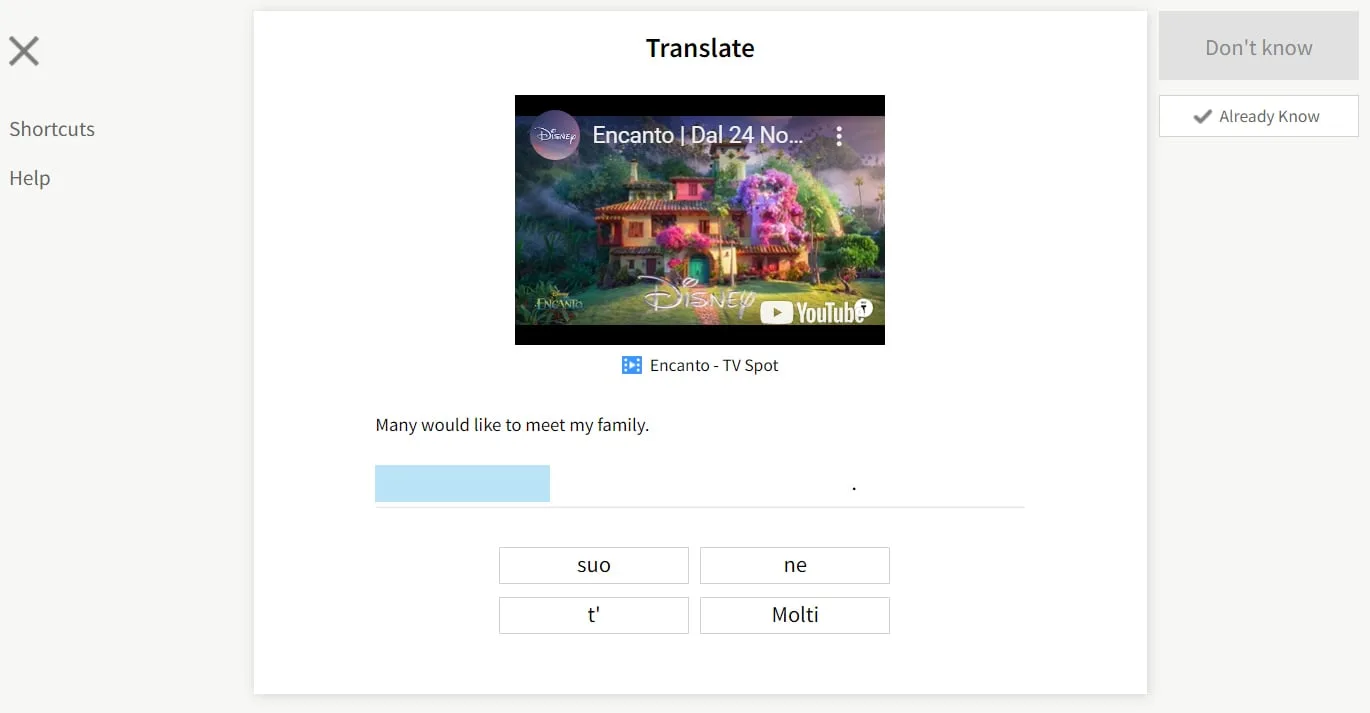 Después de ver un vídeo, puede realizar una prueba para evaluar su comprensión. Los cuestionarios a menudo implican completar espacios en blanco, traducir oraciones y seleccionar la palabra correcta entre múltiples opciones. Mientras realizaba el cuestionario, no encontré ningún tipo de ejercicio de conversación.