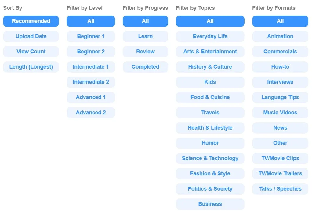 Combine FluentU con otros métodos de aprendizaje para practicar la expresión oral y utilice las opciones de filtrado para abordar necesidades de aprendizaje específicas.