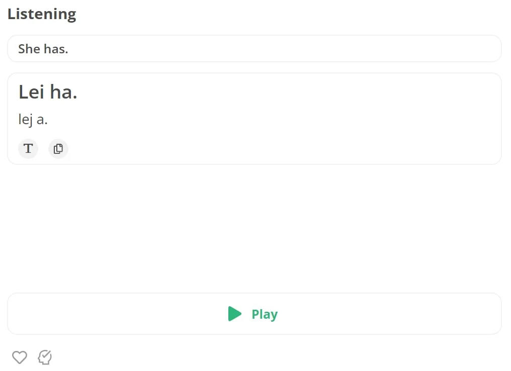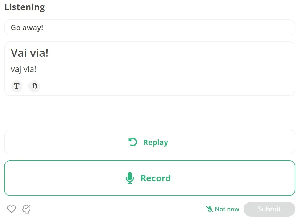 Durante la lección que probé, frases como Non oggi (Hoy no), Usciamo (Saldremos) y Balliamo (Bailemos) se repiten en bucles para reforzar el aprendizaje. Sin embargo, un inconveniente notable es la falta de retroalimentación sobre la pronunciación o la corrección, lo que hace que sea crucial que los usuarios autoverifiquen sus respuestas.