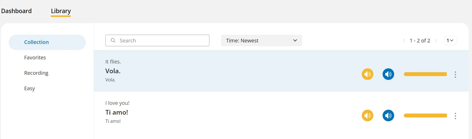 La página principal proporciona toda la información necesaria. El panel es particularmente útil, ya que permite a los usuarios realizar un seguimiento exhaustivo de su progreso. También hay una biblioteca donde los usuarios pueden revisar las palabras aprendidas, categorizar palabras como favoritas y acceder a las grabaciones. Es una configuración ordenada que simplifica la navegación en su viaje de aprendizaje de idiomas.