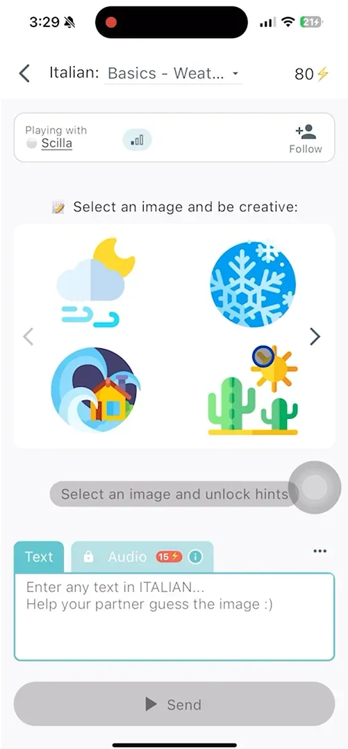 Luego, da la vuelta: mi compañero escribe una oración y yo tengo que adivinar su imagen. Básicamente es un juego de adivinanzas, pero en italiano. Me gustó lo fácil que era seguir adelante, escribiendo más y más oraciones sin siquiera darme cuenta de cuánta práctica estaba adquiriendo.
