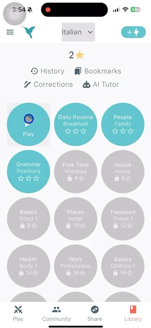 Para mantener el interés, la aplicación utiliza estrellas, karma y energía. Obtuve estrellas cuando completé partidas y esas desbloquearon nuevos temas. La pestaña Biblioteca también me permitió revisar mis oraciones anteriores, lo que fue realmente útil para ver cómo mi escritura en italiano mejoró con el tiempo.