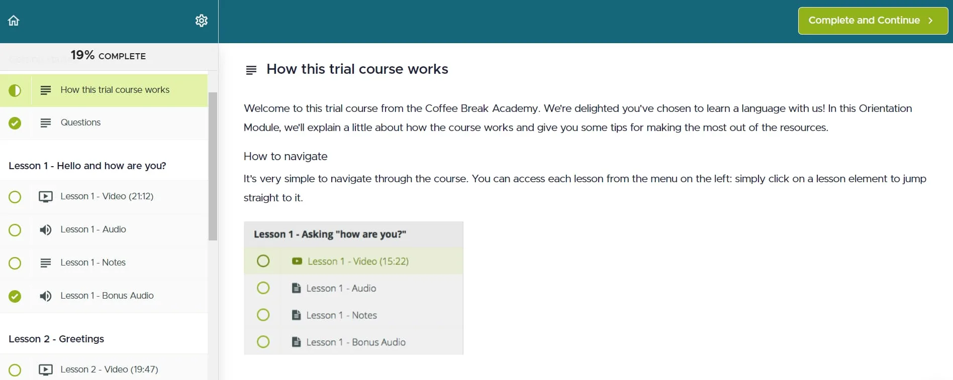 Lors de l'accès obtenu, j'ai reçu les trois premières leçons du niveau débutant. La structure de l'application semble cohérente, que vous soyez dans la version d'essai gratuite ou dans la version payante. Quoi qu'il en soit, l'essai m'a donné une bonne idée de ce à quoi m'attendre de l'application.