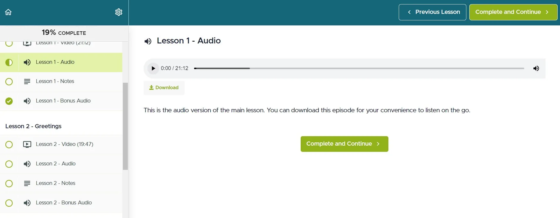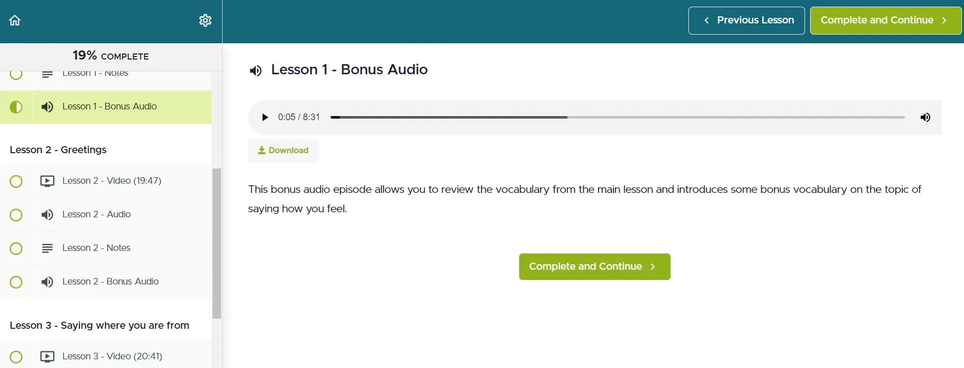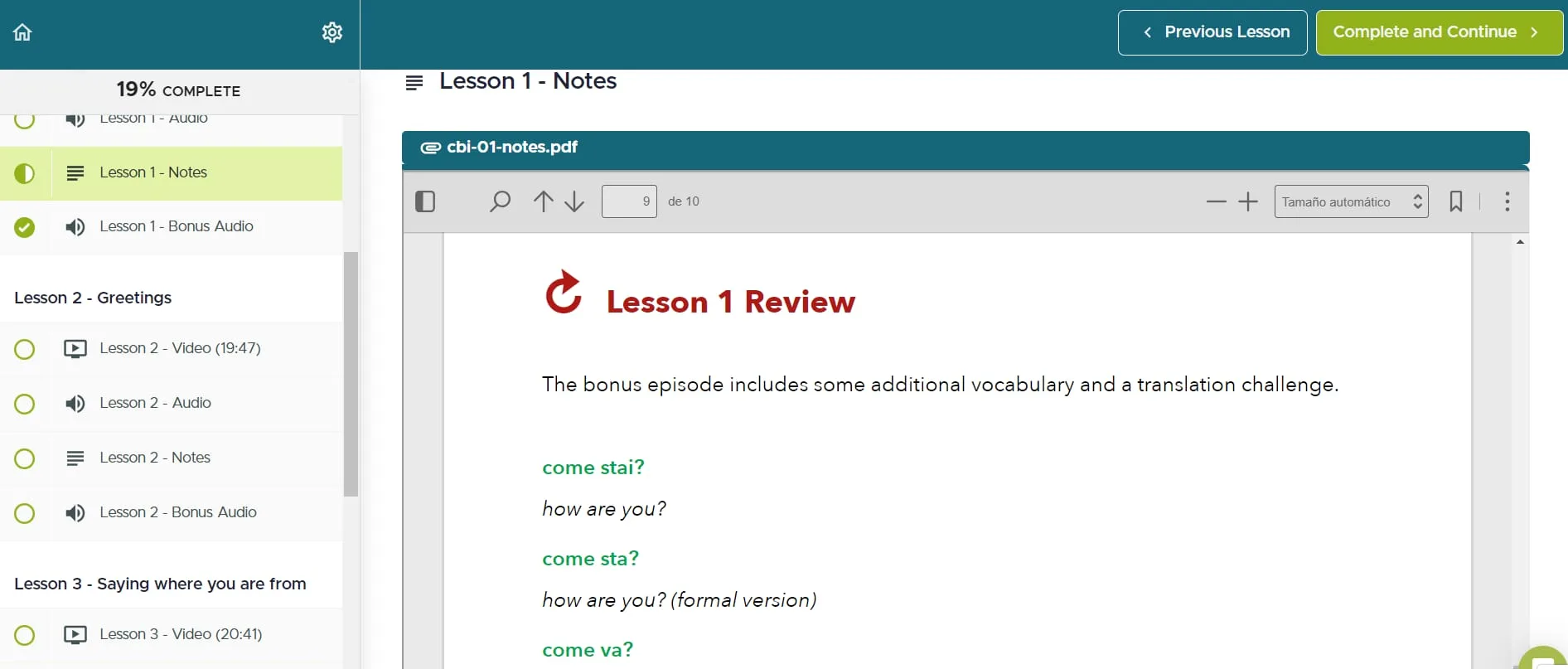 La première leçon portait sur les salutations et les questions de base, comme comment dire « bonjour » et « comment vas-tu ? » Il comprenait également quelques informations culturelles et informations géographiques sur l'Italie, rendant la session plus engageante. La structure ressemblait beaucoup à une salle de classe traditionnelle, mais avec l'ambiance décontractée d'un podcast, que j'ai trouvé rafraîchissante.