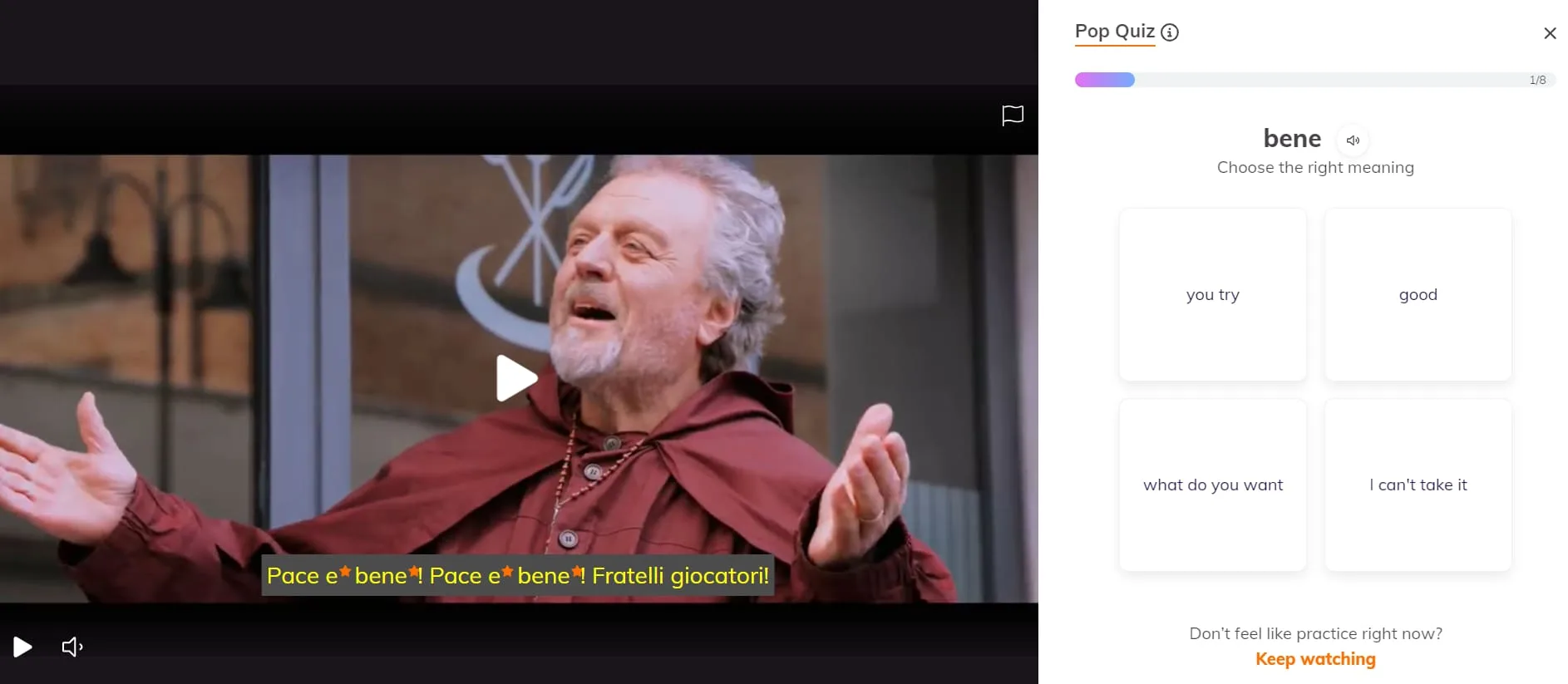 LingoPie semble fonctionner un peu comme un service de streaming, cataloguant une variété d'émissions populaires et de [musique pour la pratique des langues] (https://www.thinkinitalian.com/can-music-help-you-learn-a-language/).