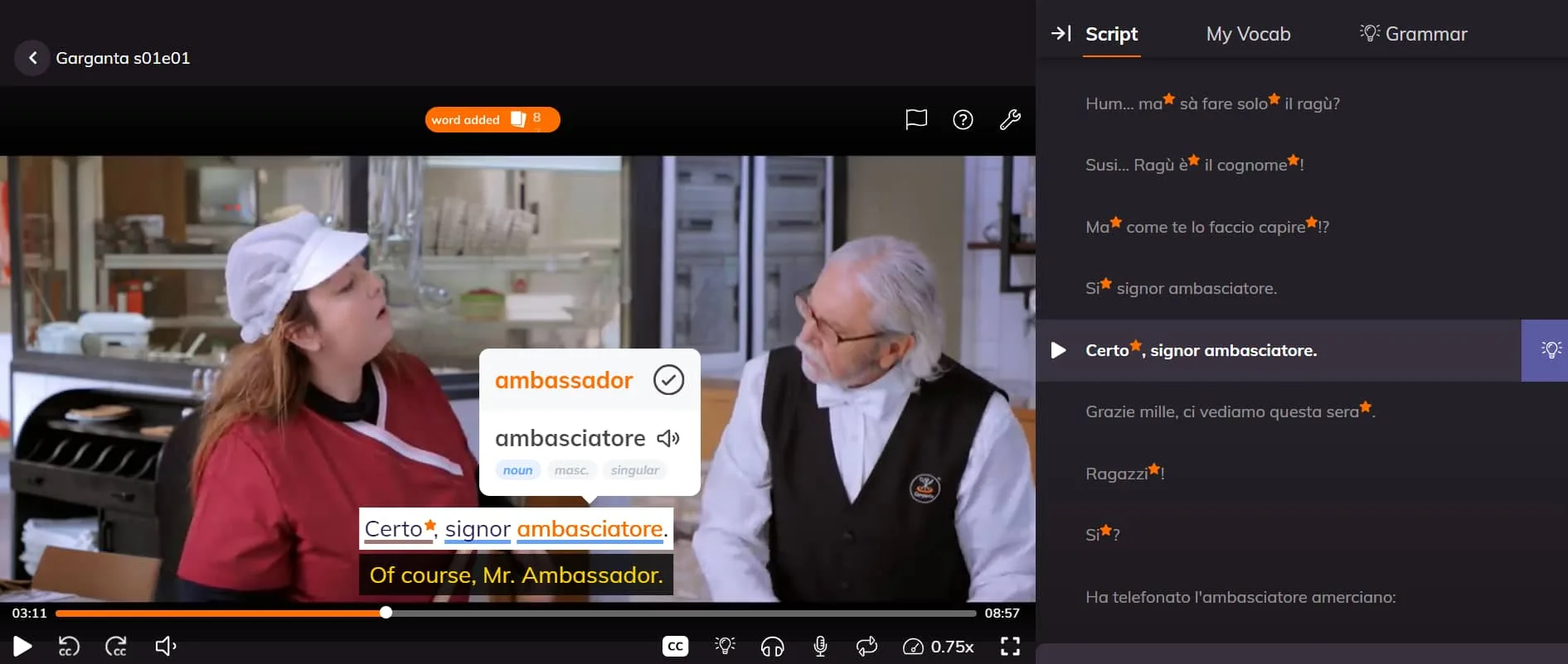 Par exemple, pendant que vous regardez une émission, vous pouvez survoler ou cliquer sur les sous-titres pour obtenir des traductions et des explications grammaticales.