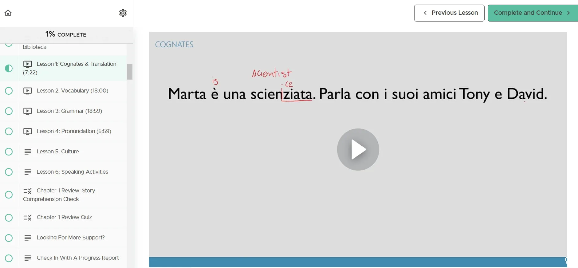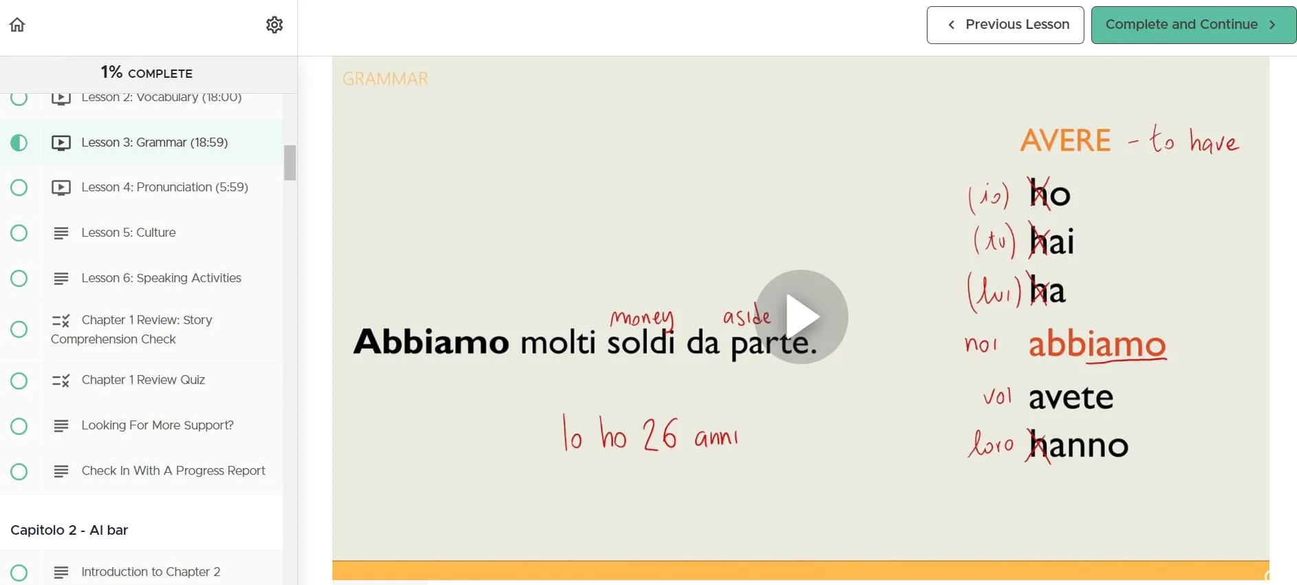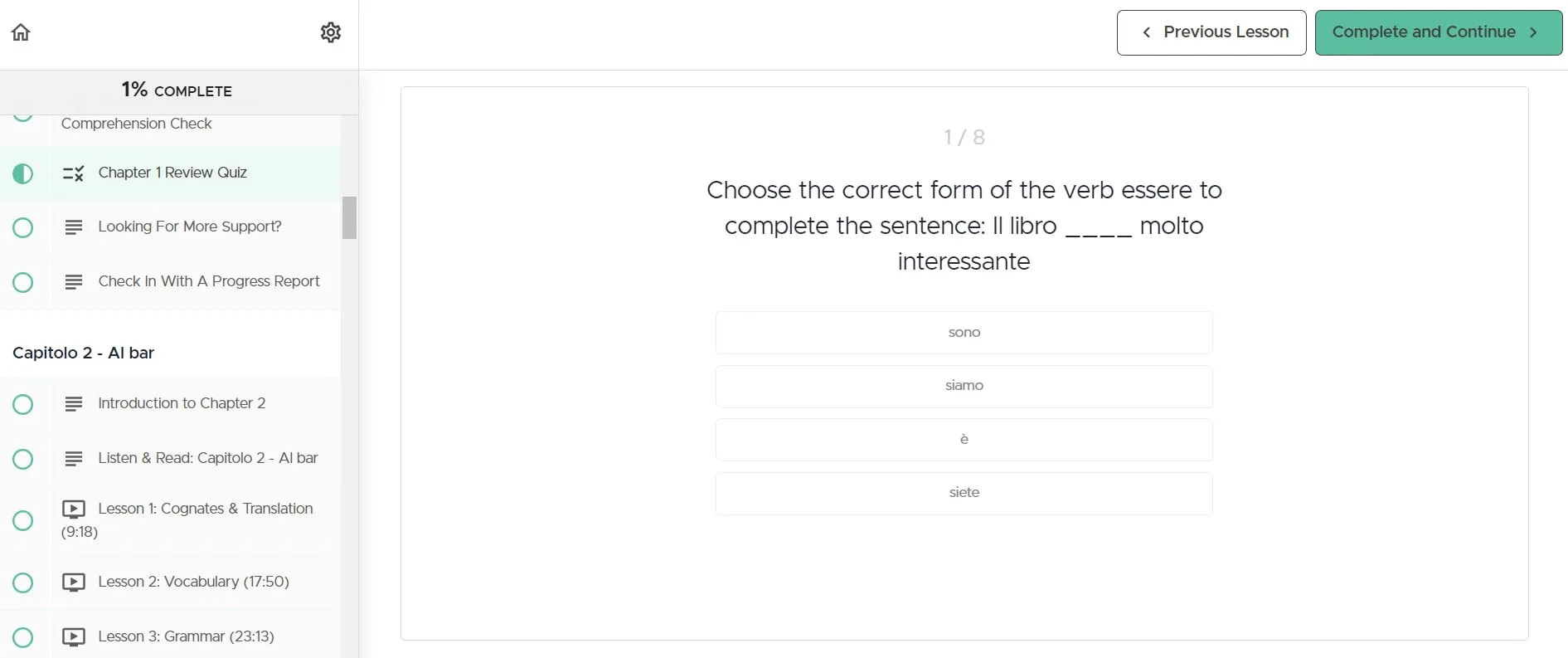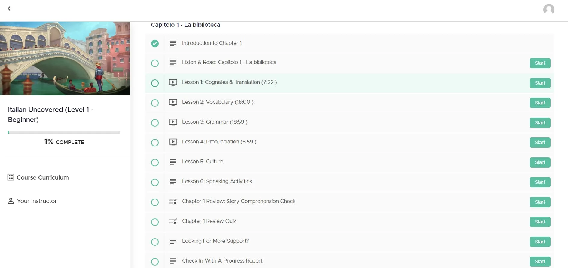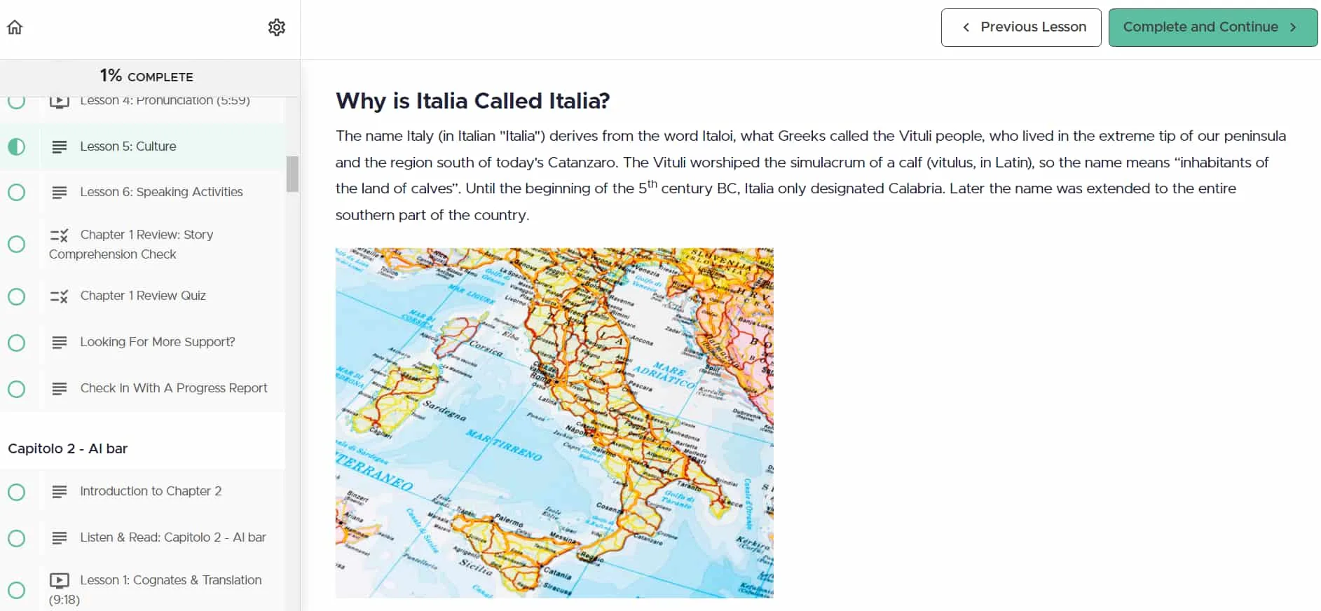 J'ai apprécié les leçons culturelles qui ont été éparpillées tout au long du cours. Ces sections fournissent un contexte historique et culturel, par exemple pourquoi l'Italie s'appelle Italia, rendant l'expérience d'apprentissage plus riche et plus immersive.