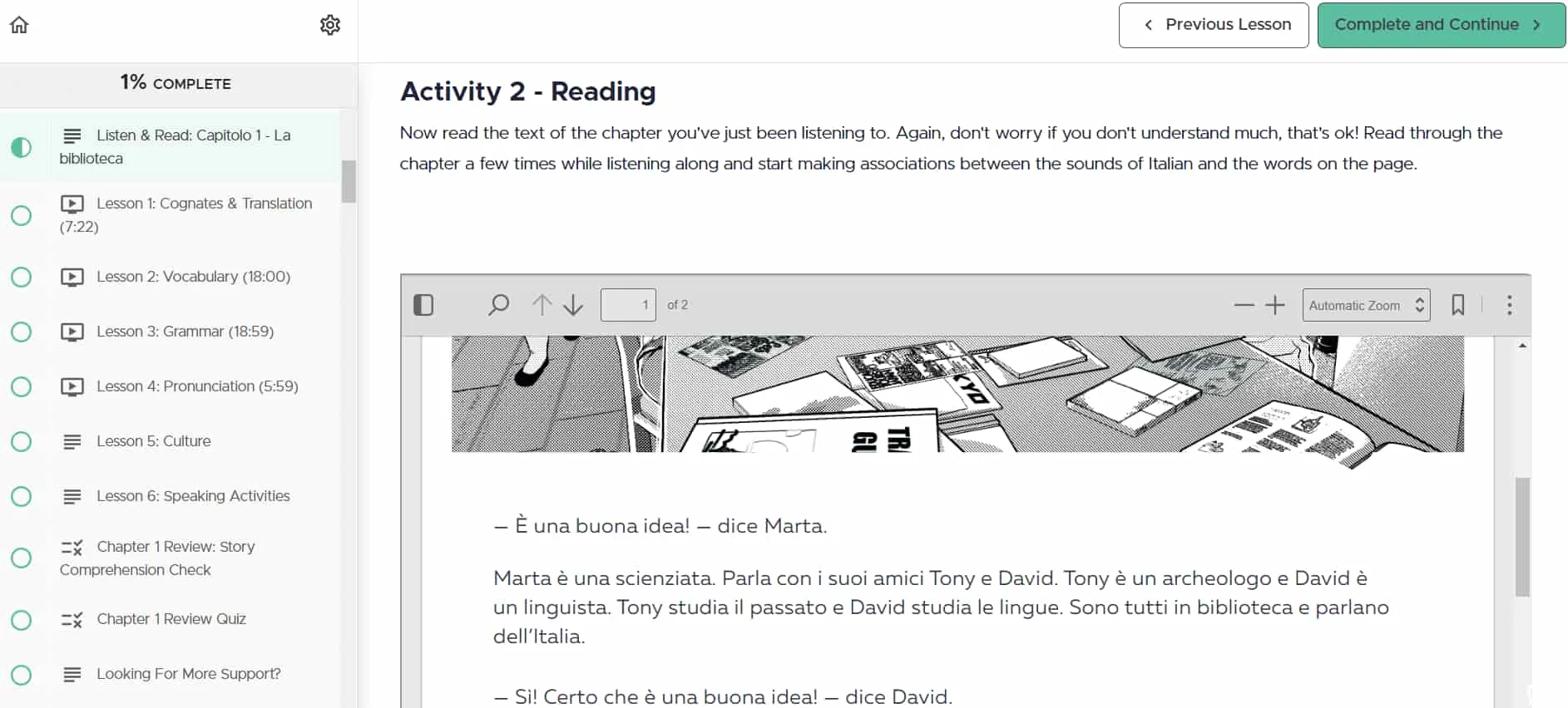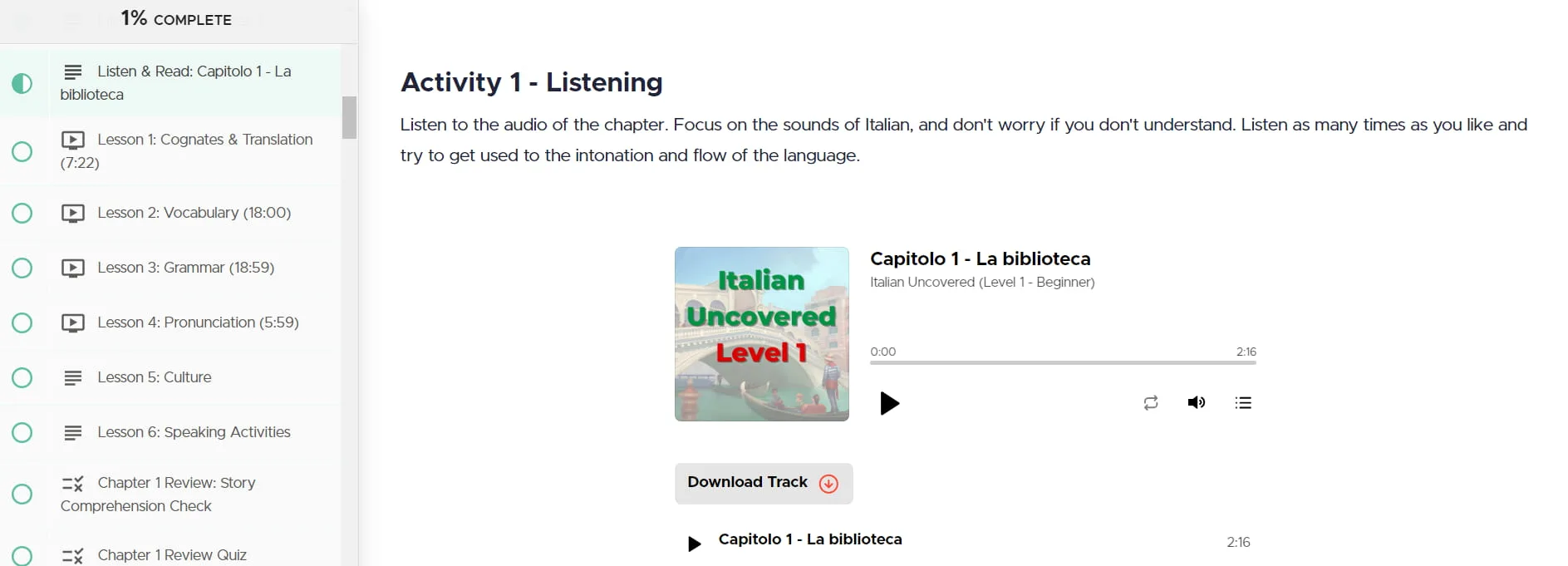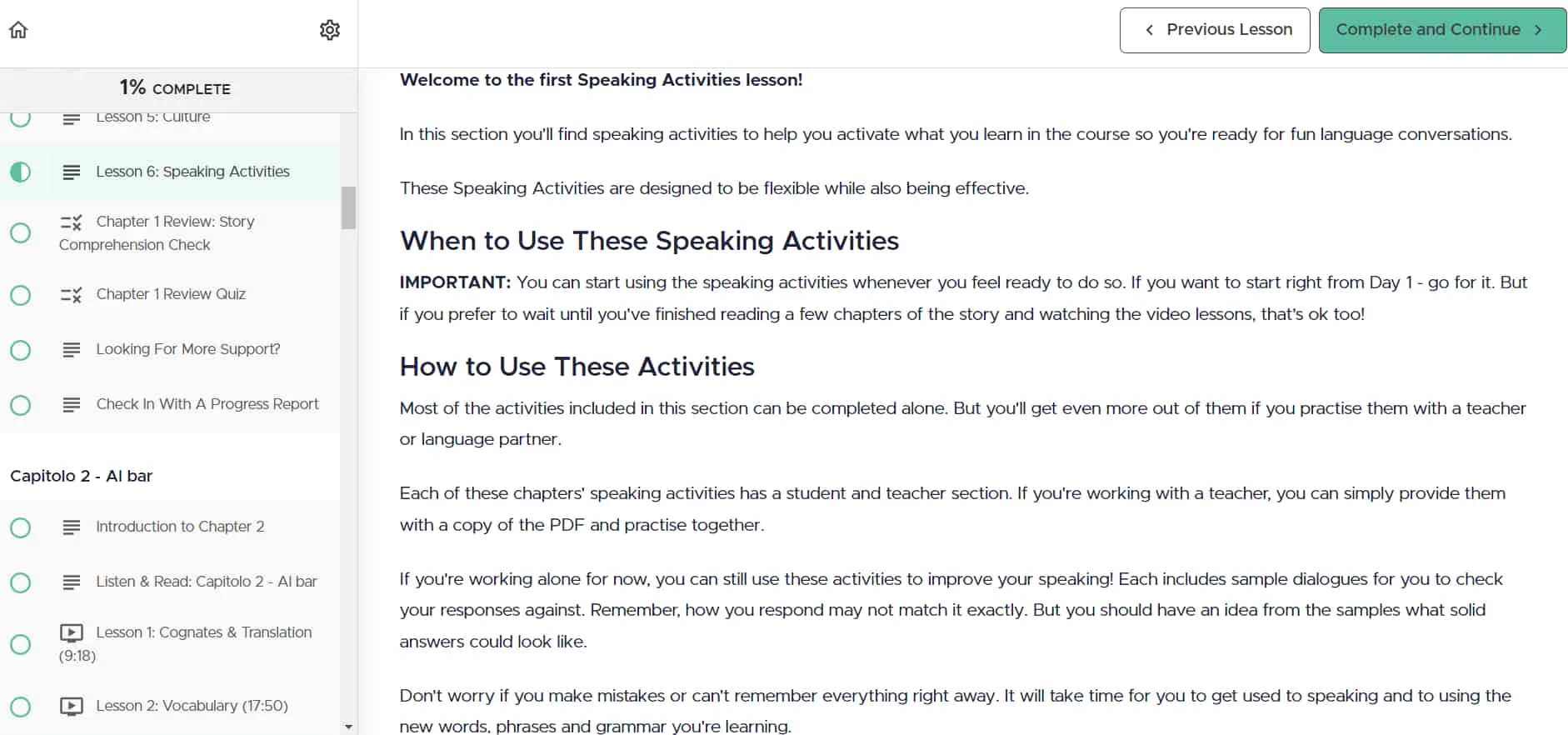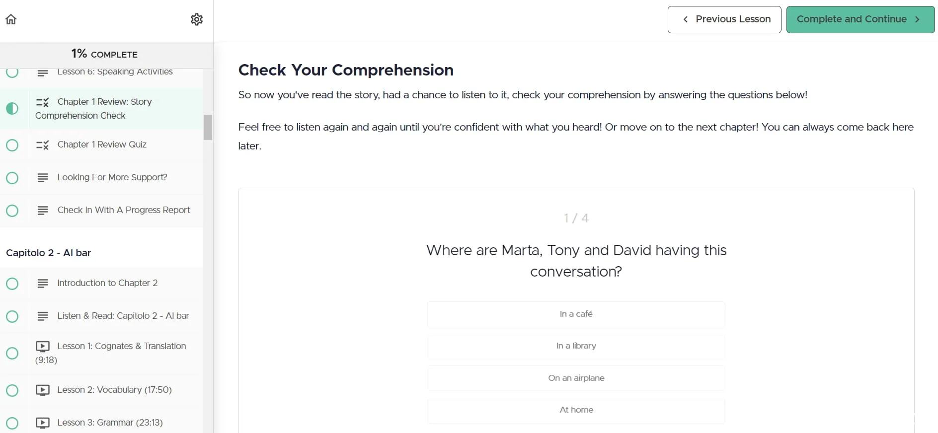 Chaque leçon commence par un chapitre de l'histoire en italien, souvent accompagné d'une transcription et d'une traduction. La voix dans les enregistrements audio est claire et engageante, même si j'ai remarqué que le volume était un peu faible même au réglage maximum. Le contenu semble soigneusement conçu pour garder les apprenants intéressés et motivés.