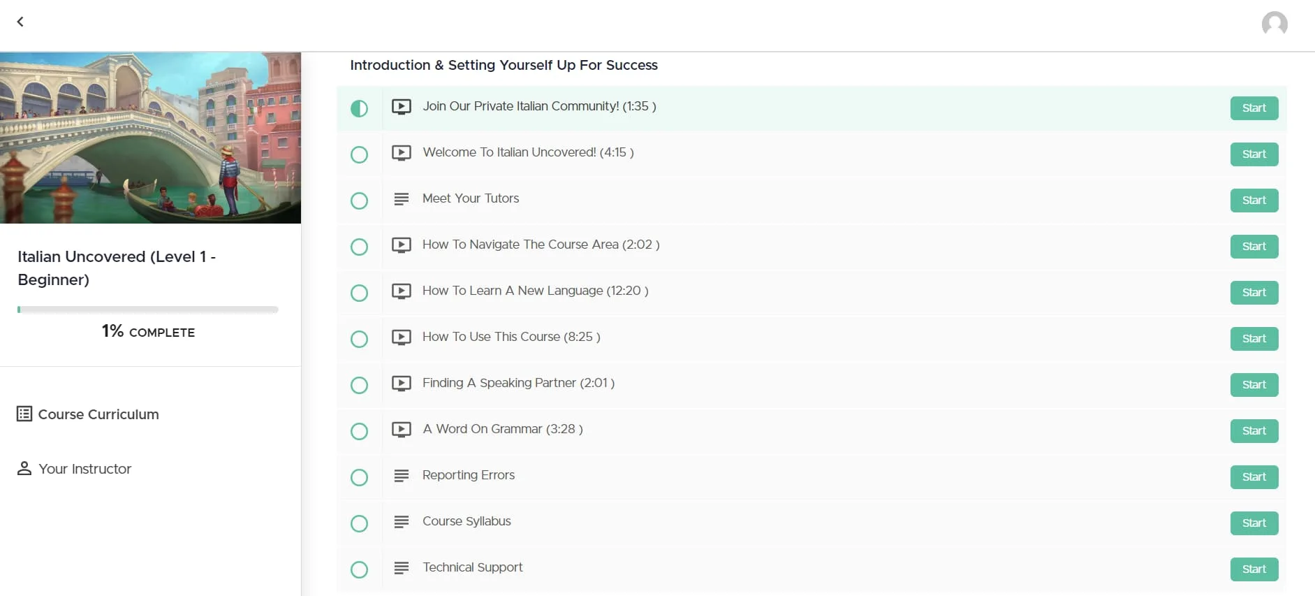 La page principale de Story Learning héberge tous les différents cours proposés. J'ai choisi de me concentrer sur l'italien. Les premières sections du cours semblaient être une introduction, guidant les nouveaux utilisateurs sur la navigation dans l'espace de cours et fournissant des conseils sur l'apprentissage des langues.