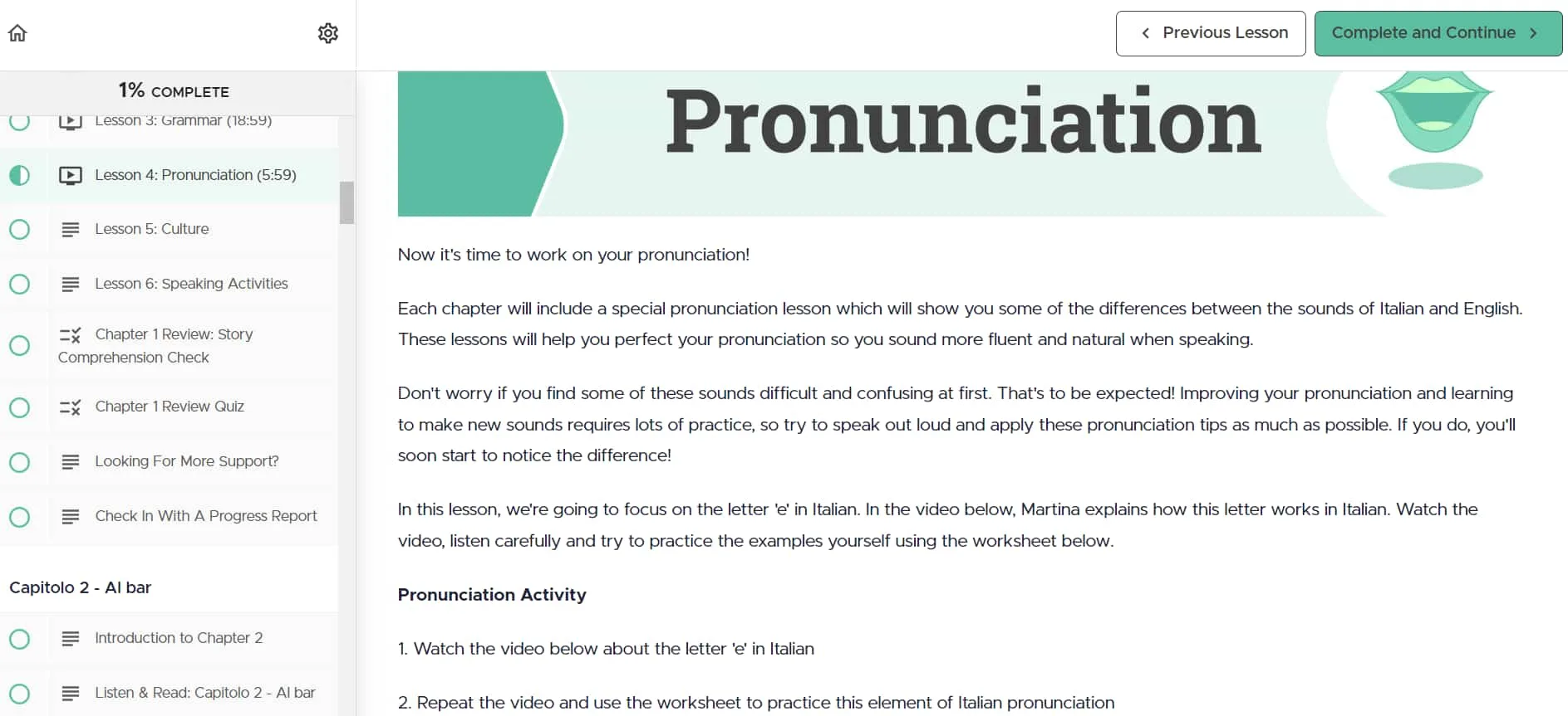 Le module de prononciation se concentre sur l'enseignement des sons de la langue italienne, avec des explications vidéo et des feuilles de travail. La méthode consistant à bouger la bouche pour émettre les sons est bien expliquée et, bien que les explications vidéo soient excellentes, ce serait encore mieux si l'application fournissait la prononciation de mots ou de phrases individuels à la demande.