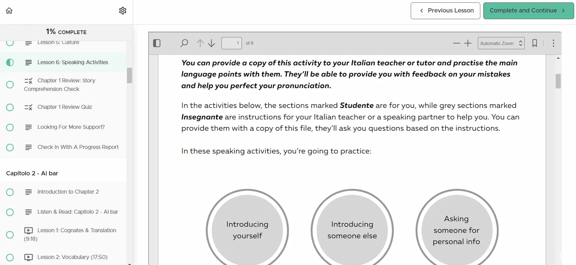 La partie la plus attendue de ma revue était les activités orales. Malheureusement, j'ai découvert que l'application fournit des documents PDF destinés à être utilisés avec un tuteur ou un enseignant.