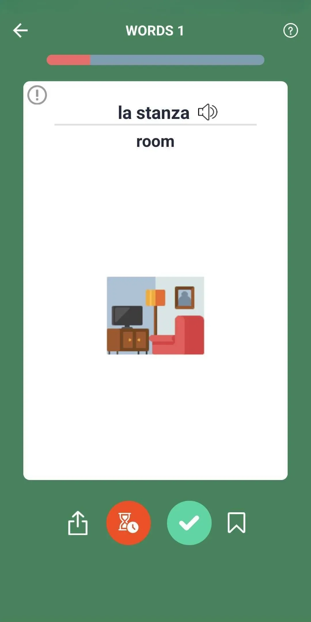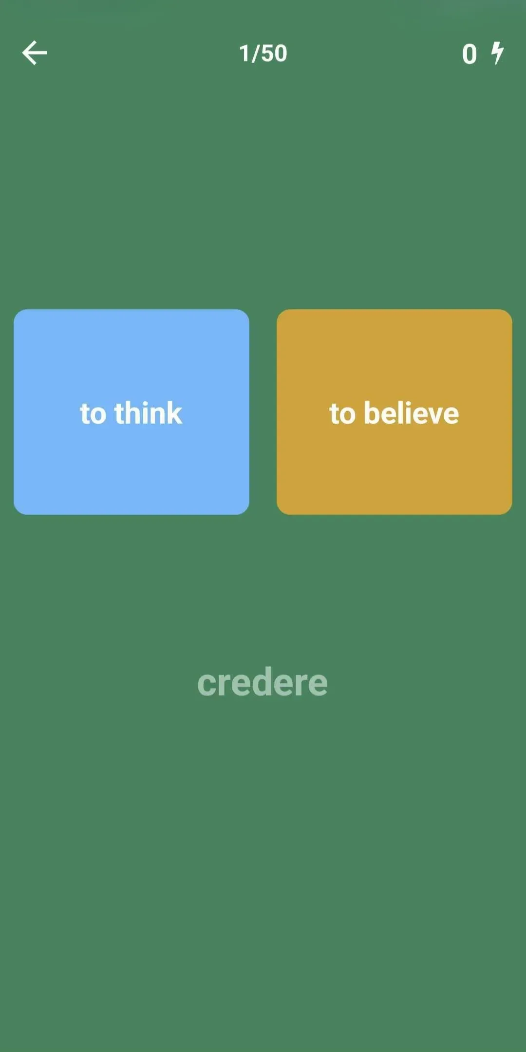 La plupart de l'apprentissage se fait via des flashcards. Je parcours de nouveaux mots italiens, j'écoute la prononciation et je décide si je veux continuer à réviser un mot ou le marquer comme appris. Il existe également de petits mini-jeux que vous pouvez utiliser pour renforcer les mots : correspondance, orthographe et exercices de réaction rapide.