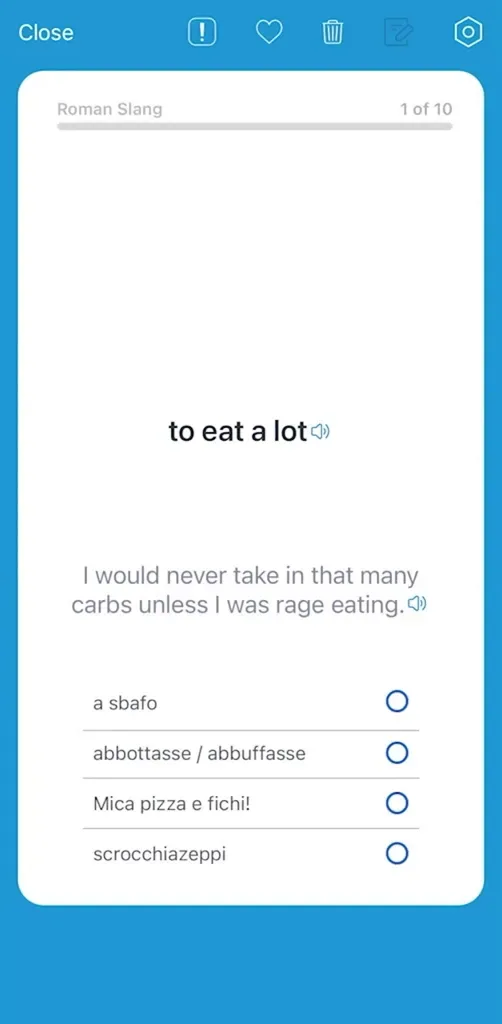 Comme je me concentrais sur l'italien, j'ai principalement utilisé les flashcards et le mode saisie. Avoir l’audio sur chaque carte s’est avéré utile, en particulier pour pratiquer la prononciation en déplacement.