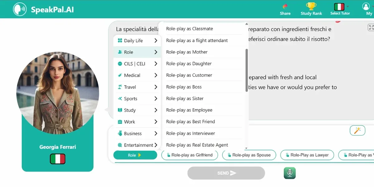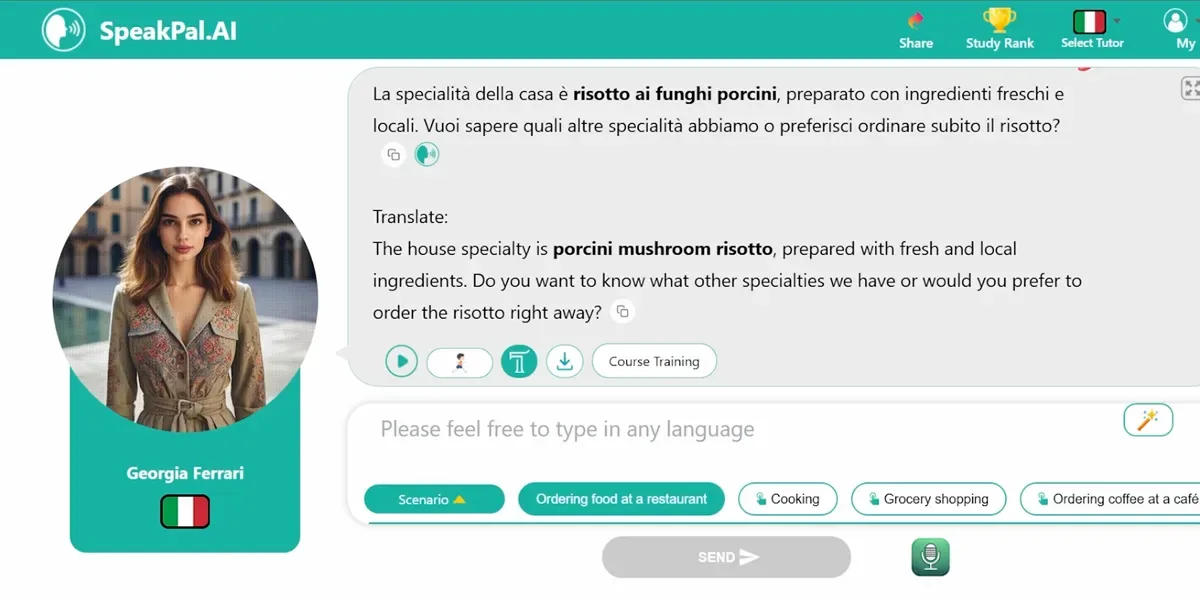 De gesprekken zijn flexibel en contextgericht. Ik kon bijvoorbeeld situaties simuleren zoals eten bestellen, mezelf voorstellen of de weg vragen – allemaal in het Italiaans. Het richt zich echt op het opbouwen van vertrouwen door gebruik, in plaats van alleen maar woorden te onthouden.