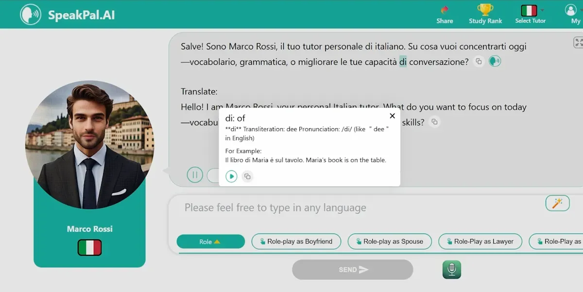 U kunt kiezen uit meer dan 30 -talen, en ja, Italiaans is inbegrepen. U klikt gewoon op de vlag van de taal die u wilt leren en begint met chatten. Ik vond het leuk dat je je berichten kunt typen of uitspreken, en de AI reageert met een realistische stem. Het voelt vrij natuurlijk voor een chatbotervaring.