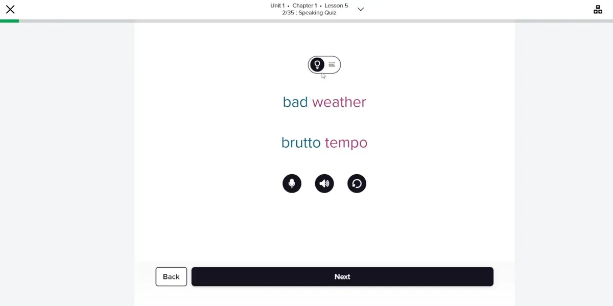 Fiecare curs de italiană este împărțit în unități, capitole și lecții. Lecțiile sunt construite în jurul unor conversații scurte - de exemplu, salutări la o cafenea, întâlniri cu cineva nou sau solicitarea de indicații în Roma. Fiecare lecție începe cu un dialog rapid între vorbitori nativi, apoi o descompune pas cu pas. Am putut să ascult fiecare propoziție, să văd atât traducerea italiană, cât și cea engleză și chiar să comut între o traducere literală și una naturală. Aceasta este de fapt una dintre caracteristicile mele preferate - vă ajută să înțelegeți structura reală a propozițiilor italiene. Există, de asemenea, codificarea culorilor - cuvintele în italiană sunt evidențiate pentru a se potrivi cu echivalentele lor în engleză. Este un lucru mic, dar chiar ajută atunci când încerci să te obișnuiești cu ordinea cuvintelor în italiană.