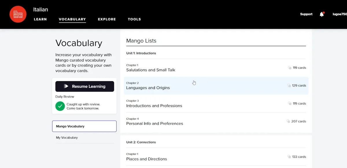 Deci, Mango Languages este o platformă online și o aplicație mobilă în care puteți învăța peste 70 de limbi, inclusiv italiana, desigur. Este adesea disponibil gratuit prin bibliotecile publice, dar vă puteți abona direct și pentru aproximativ 12 dolari pe lună pentru o limbă sau 20 de dolari pentru toate. Interfața este cu adevărat curată, ușor de utilizat și se simte mai profesională decât unele dintre aplicațiile prea gamificate de acolo.