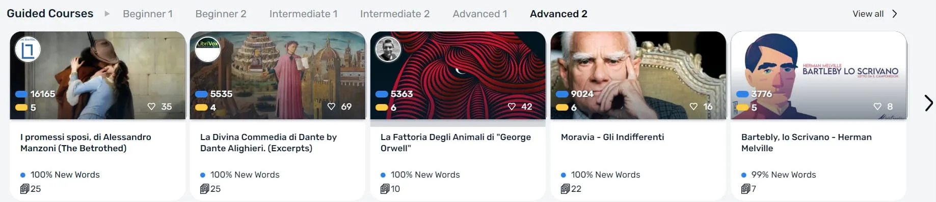 Чтобы лучше понять структуру LingQ, я решил погрузиться в один из их продвинутых курсов. Некоторая часть контента, по-видимому, была разделена по уровням сложности, но при ближайшем рассмотрении стало ясно, что тег «продвинутый» в основном указывает на сложный материал, а не на продвинутый дизайн обучения.
