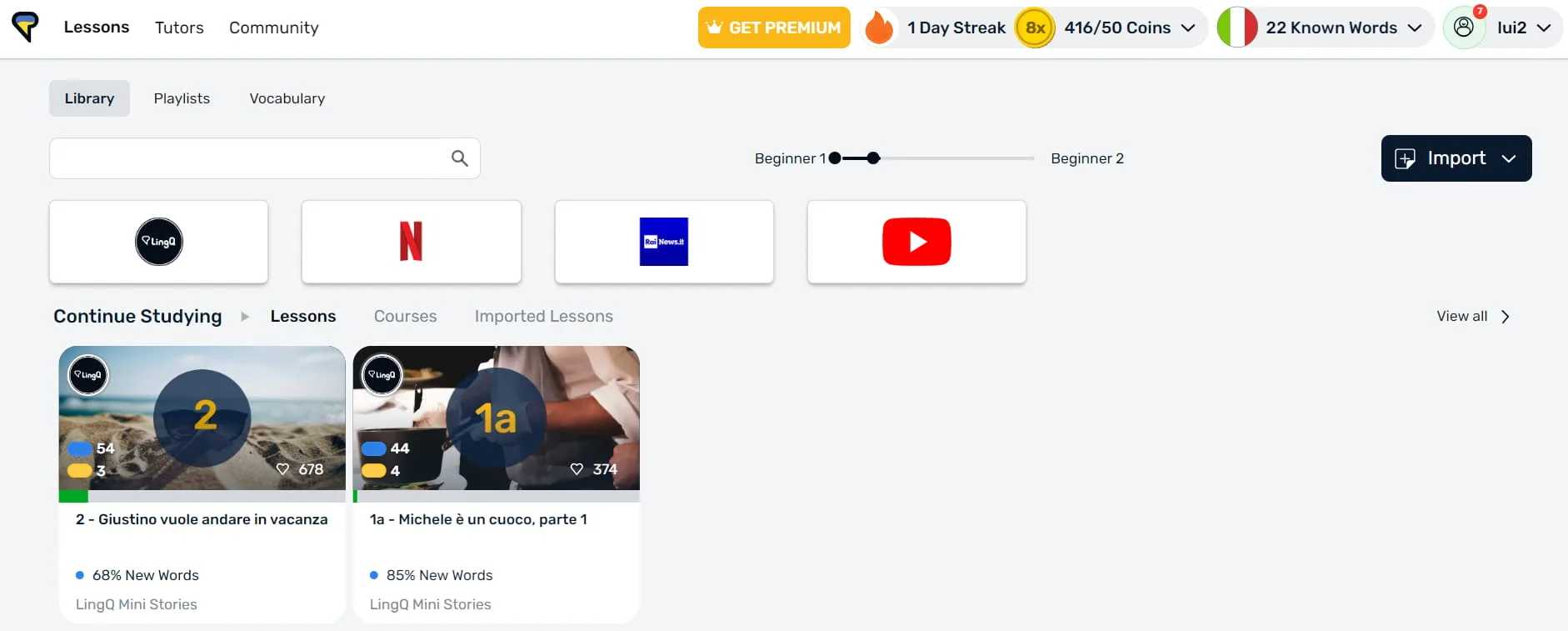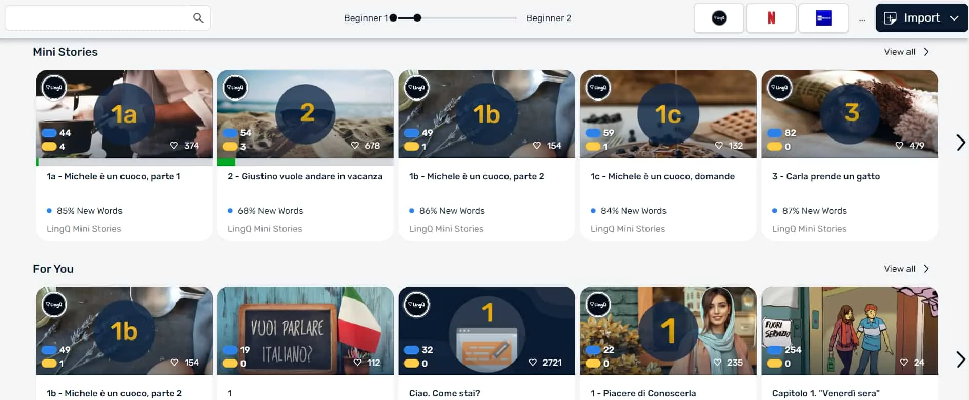 На первый взгляд LingQ кажется немного ошеломляющим из-за большого количества контента. Контент разделен на мини-истории, уроки словарного запаса, актуальные темы и рекомендации. Кажется, что это огромная коллекция различных материалов, что может оказаться сложной задачей для новичка.