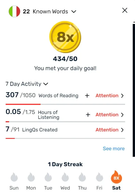 LingQ работает по системе баллов, где пользователи зарабатывают монеты, выполняя уроки и мероприятия.