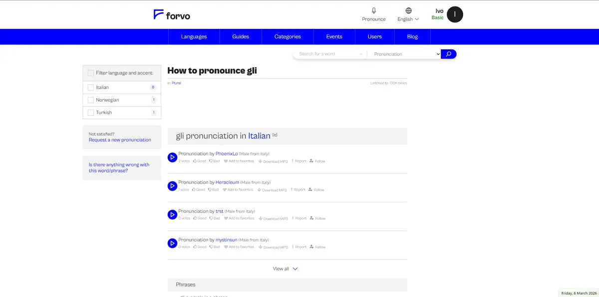 不过,也有一些可以改进的地方。由于所有音频都来自用户,质量可能不太一致。有些录音听起来非常清晰,有些则有点闷或被截断。另外,Forvo 只提供孤立的单词或短语,而不是完整句子——所以你得不到语境、节奏或自然语调。如果你想掌握较长句子中的意大利语发音,仍然需要其他资源。移动应用相比网站也显得有点过时,而且速度更慢。就我个人而言,我更喜欢在桌面端使用 Forvo——体验更流畅。最后,免费版有一些广告,虽然不算太打扰。如果你想支持这个平台,可以通过一个小额高级计划来移除广告。