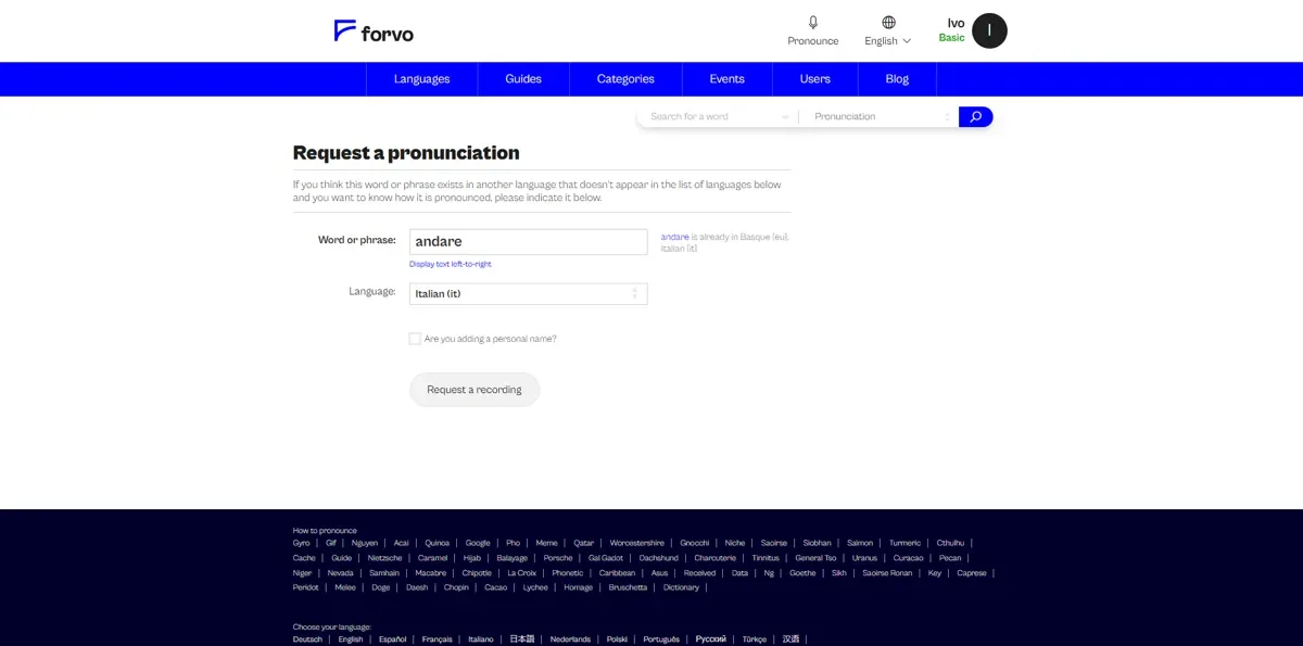 它的使用方式很简单。你只需访问 forvo.com 或使用移动应用。输入你想听的单词,然后点击播放。你会看到每个国家的旗帜、说话者的名字,有时还有他们所在的地区或城市。如果某个发音还不存在,你可以提交请求,社区里的母语者会为你录制。我用几个尚未列出的意大利语单词试过这个功能,结果真的有效——几天后就有人上传了发音。你也可以用自己的母语录制发音,所以这是一个双向社区——你在学习,也可以帮助别人。