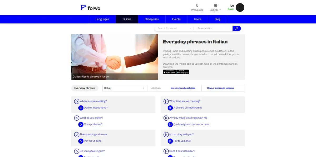 所以,Forvo 不是那种带有课程或语法练习的典型语言学习应用。相反,它更像是一个真实声音的巨大资料库。你输入一个词——比如 ciao、arrivederci,或者像 gli 这样更棘手的词——然后就能听到意大利母语者如何发音。它有趣的地方在于,你通常会听到几个不同的说话者,所以可以感受到地区差异——来自米兰的人听起来可能和来自罗马的人略有不同。如果你在意发音是否自然,这一点非常有用。