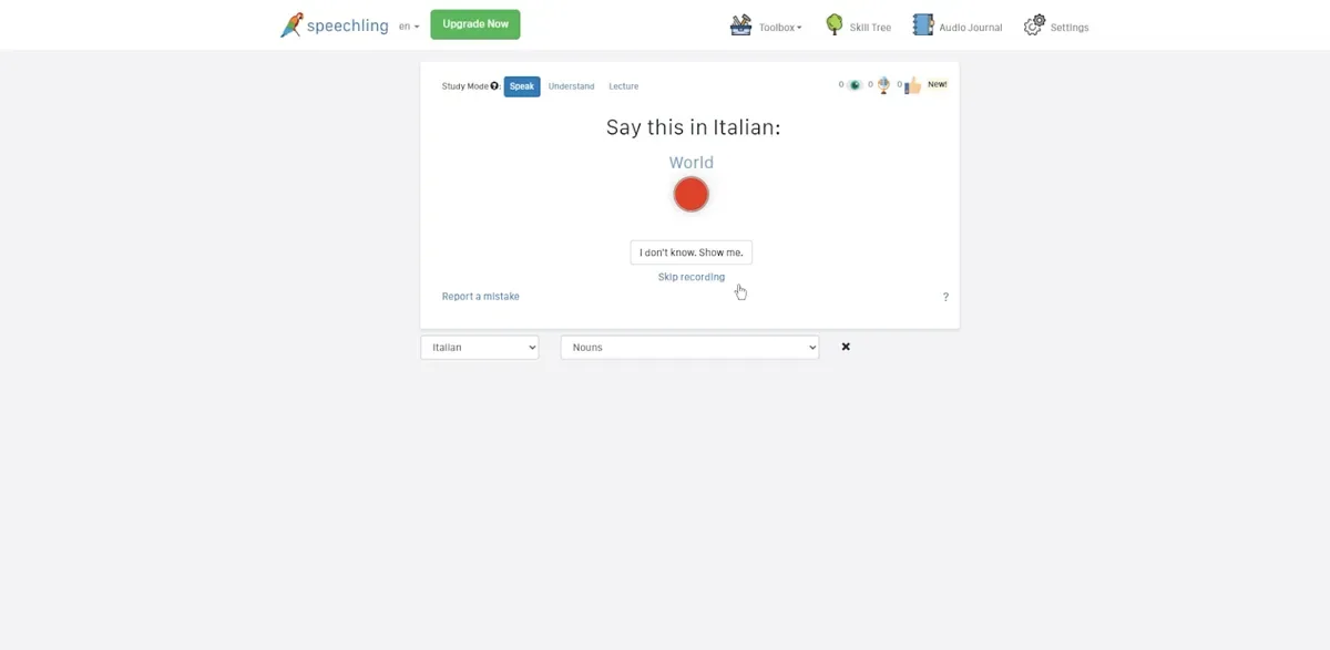 当我第一次加入 Speechling 时,我看到的是一个非常简洁的界面。它并不花哨,但直奔主题。我可以选择意大利语作为目标语言,然后从那里选择不同的练习方式——比如口语、听力,甚至两者结合。