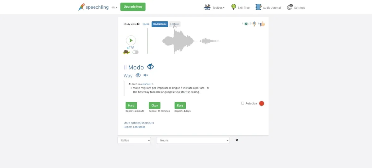 我在 Speechling 中发现的最大优势之一,是可用的意大利语音频数量非常庞大。它有超过 10,000 个句子,这意味着我永远不会缺少练习材料。另一个巨大优势是来自教练的反馈。有时直到我收到纠正,才意识到自己某个单词发错了音,这真的很有帮助。我也很欣赏这个系统的灵活性——我可以放慢音频速度,想重复多少遍都可以;如果我使用付费计划,甚至还能下载材料进行离线练习。这让整个过程非常适合我的学习风格。
