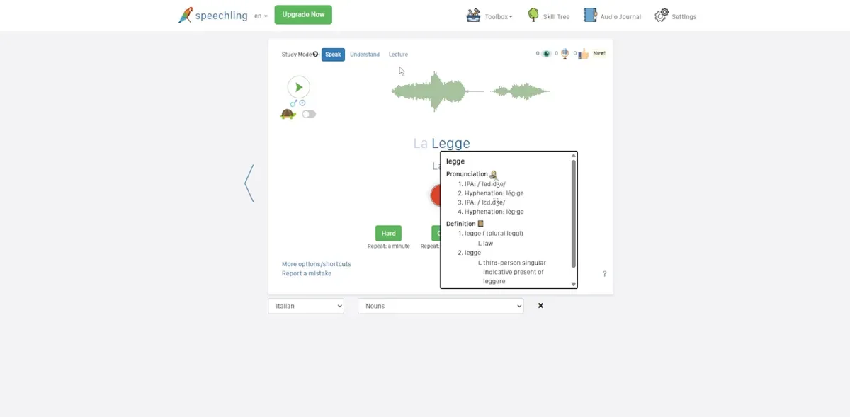 我最先注意到的一点是,Speechling 给我提供了数千个意大利语母语句子,由男女说话者分别录制。我可以听、跟读,并录下自己的声音,比较自己与原音有多接近。